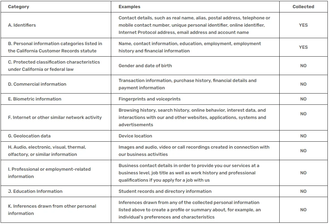 the categories of personal information that we collect;